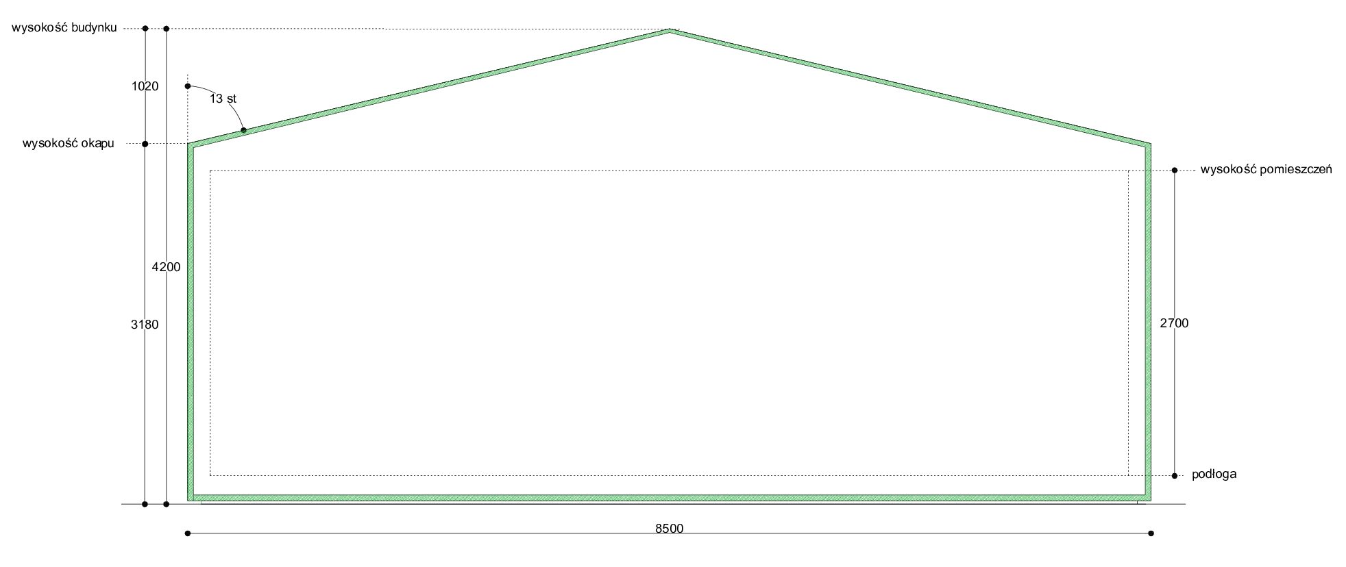 • Kąt nachylenia dachu: 13 stopni